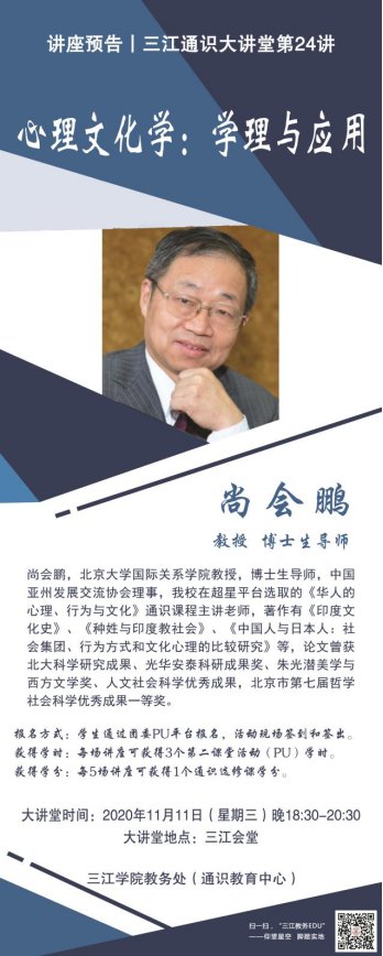 大讲堂专家:尚会鹏,北京大学国际关系学院教授,博士生导师,中国亚州发展交流协会理事,beat365官网在超星平台选取的《华人的心理、行为与文化》通识课程主讲老师,著作有《印度文化史》、《种姓与印度教社会》、《中国人与日本人:社会集团、行为方式和文化心理的比较研究》等,论文曾获北大科学研究成果、光华安泰科研成果奖、朱光潜美学与西方文学奖、人文社会科学优秀成果,北京市第七届哲学社会科学优秀成果一等奖。