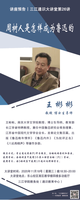 大讲堂专家:王彬彬,南京大学文学院教授、博士研究生导师,教育部长江学者特聘教授,兼任中国鲁迅研究会常务理事、江苏省中国现代文学学会会长。发表论文数百篇,出版《鲁迅晚年情怀》《鲁迅内外》《为批评正名》《八论高晓声》等著作多部。