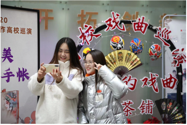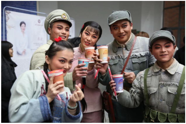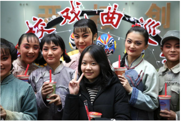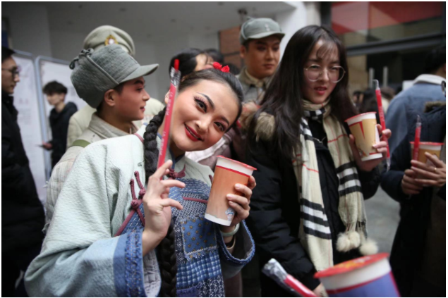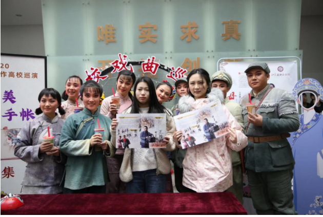 岁月如梭,淮海战役的精神却永远流传。散场时,由新华日报精心策划的“戏曲奶茶”温暖了冬日里前来观演的学生,也温暖了风尘仆仆从南通赶来的梆子剧团。当天他们化妆、吃饭、休息全都在路上,可是晚上七点半,每一位演员都精神抖擞、神采奕奕地站在台上,用一片热爱艺术的赤诚之心为学生们献上满分的表演。学生们在“奶茶铺子”旁争相和演员们合影,大家手捧奶茶,其乐融融。