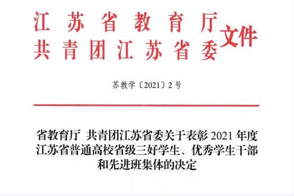 根据《省教育厅、共青团江苏省委关于表彰2021年度江苏省普通高校省级三好学生、优秀学生干部、优秀毕业生和先进班集体的决定》(苏教学〔2021〕2号文件),beat365官网赵雨欣等10名同学荣获省级三好学生,曹飞龙等11名同学荣获优秀学生干部荣誉称号,电子信息工程学院12018096A等7个班级荣获省先进班集体荣誉称号。