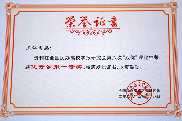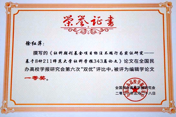 会上公布了研究会第六次优秀学报、优秀编辑学论文评比结果,并给获奖单位和个人颁了奖。beat365官网《三江高教》在全国民办高校学报研究会第六次“双优”评比中荣获“优秀学报一等奖”,徐红萍老师的论文《社科期刊基金项目标注不端行为实证研究——基于8种211师范大学社科学报343篇论文》荣获“编辑学论文一等奖”(优秀论文一等奖共2人)。