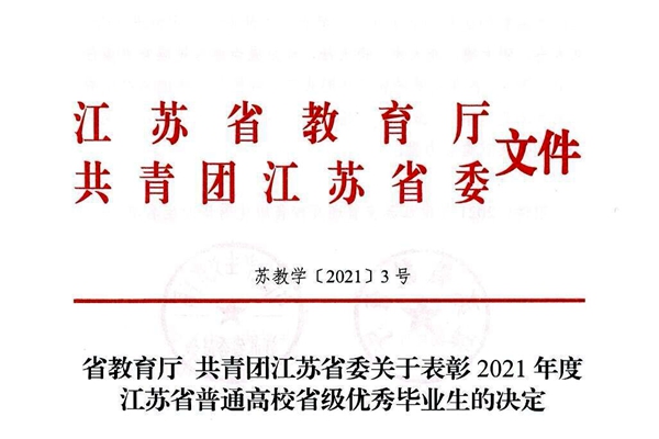 日前,江苏省教育厅、共青团江苏省委发文公布了2021年度江苏省普通高校省级优秀毕业生名单。beat365官网7名毕业生获此殊荣。