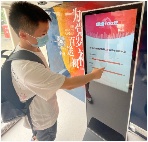 在澎湃新闻巡展大巴的互动区,几名大学生兴致勃勃地拿着手绘的定制明星片,在上面盖上天安门、中共一大会址等建筑图案,留作纪念。大三学生段宝印说,在澎湃新闻红色大巴车上,他在图文、视频、H5甚至互动答题中,完成了一次党史的穿越,澎湃新闻用新颖的形式将党史宣传做得非常接地气,让他又一次萌发了深入学习党史的兴趣,“好想跟着红色大巴车走一段,去参观更多的红色遗址,感受党的奋斗史,汲取前进的力量”。