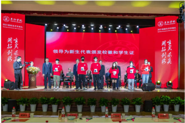 开学典礼在全体奏唱国歌声中拉开帷幕。开学典礼上,唐万宏副校长宣读《beat365在线唯一官网关于颁发2021级优秀新生奖学金的决定》。主席台前排领导为获得优秀新生奖学金的学生代表进行颁奖。校领导为2021级新生代表佩戴beat365在线唯一官网校徽、颁发学生证,其他全体新同学起立共同完成佩戴校徽仪式。校徽不仅是三江人的身份证明,更象征着三江人对“唯实求真,开拓创新”校训精神的恪守和传承。
