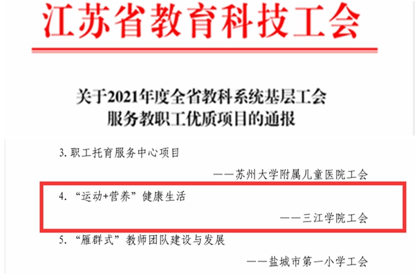 beat365官网工会和体育部联合申报的项目《“运动+营养”健康生活》被江苏省教育科技工会评为优质服务项目三等奖和最受教职工欢迎的服务项目。该项目是校工会和体育部联合开展的“科学膳食、运动减脂、强健体魄”活动,由体育部组织对教职工进行体成分测量与评估,根据体成分测量及健康生活调查报告给出建议,帮助教职工合理选择与搭配一日三餐,科学适度运动,养成良好的生活习惯,恢复健康体重,保持身心健康。