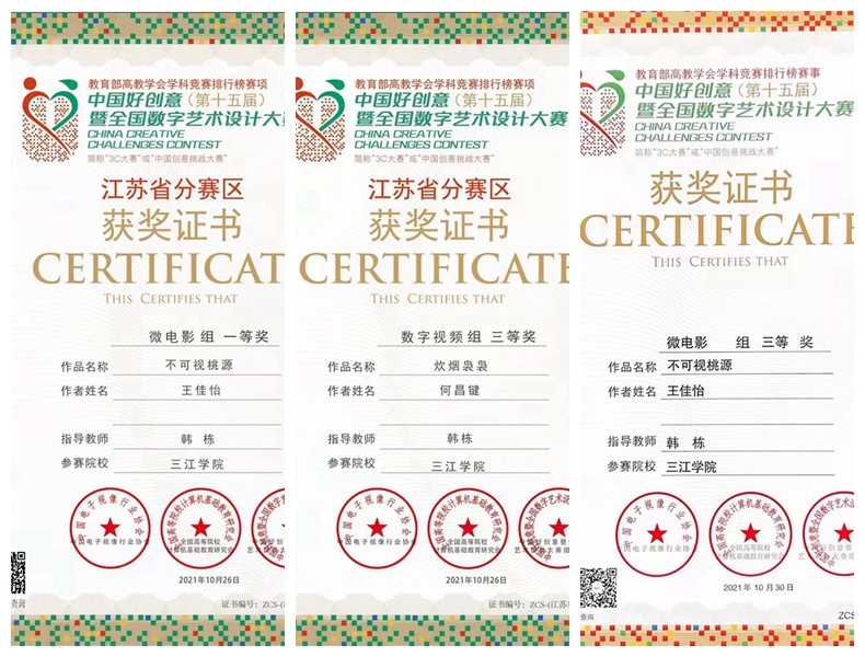 据悉,本次大赛共有1300多所院校参与角逐,参赛作品多达七万多件。经过省赛、国赛层层选拔,beat365官网广播电视编导专业系主任韩栋老师指导的2017级何昌键同学的《炊烟袅袅》喜获数字视频组省级三等奖;2020级王佳怡同学短片作品《不可视桃源》获得微电影组省级一等奖、国家级三等奖。