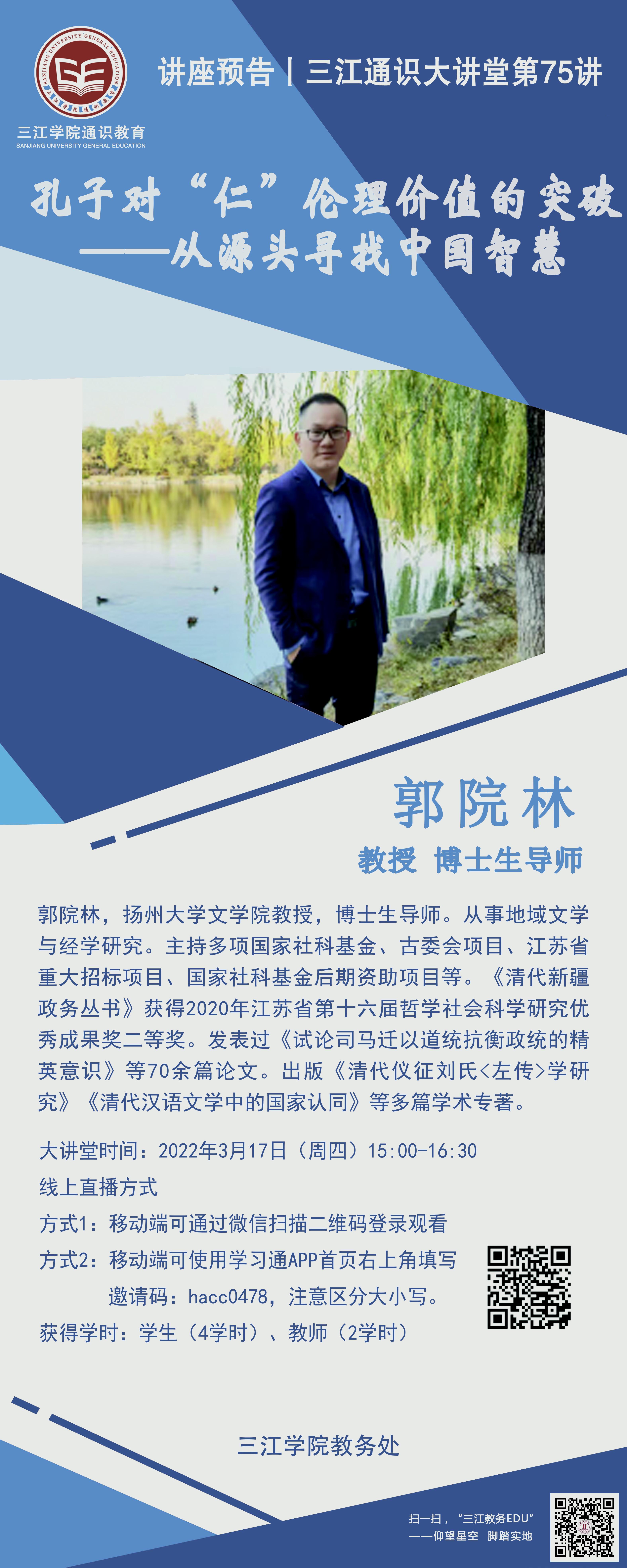 “三江通识大讲堂”是落实beat365官网“三教融合”人才培养模式的重要途径,是“三位一体”通识教育体系中“氛围营造”模块的重要组成部分,是学校落实“立德树人”根本任务的重要落脚点之一,是坚定学生的价值信仰、拓宽视野、活跃思维的重要途径之一。
