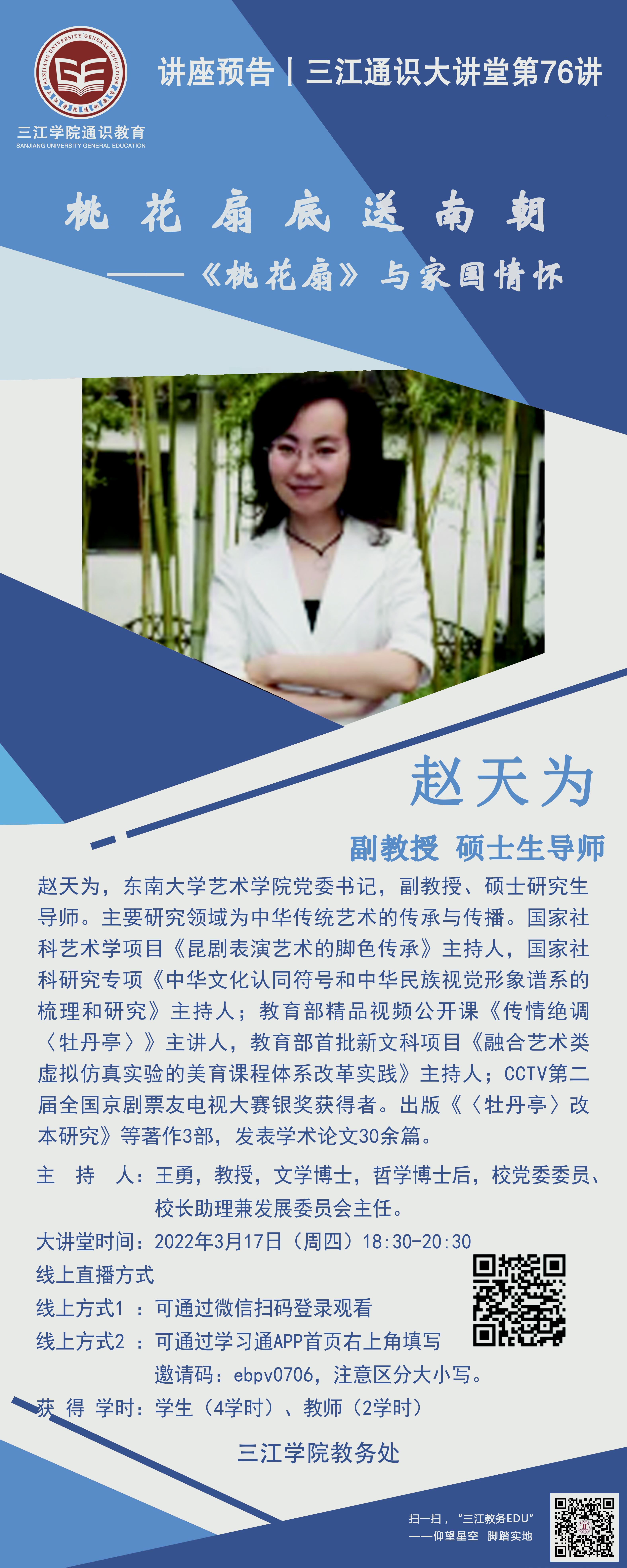 大讲堂专家:赵天为,东南大学艺术学院党委书记,副教授、硕士研究生导师。主要研究领域为中华传统艺术的传承与传播。国家社科艺术学项目《昆剧表演艺术的脚色传承》主持人,国家社科研究专项《中华文化认同符号和中华民族视觉形象谱系的梳理和研究》主持人;教育部精品视频公开课《传情绝调〈牡丹亭〉》主讲人,教育部首批新文科项目《融合艺术类虚拟仿真实验的美育课程体系改革实践》主持人;CCTV第二届全国京剧票友电视大赛银奖获得者。出版《〈牡丹亭〉改本研究》等著作3部,发表学术论文30余篇。