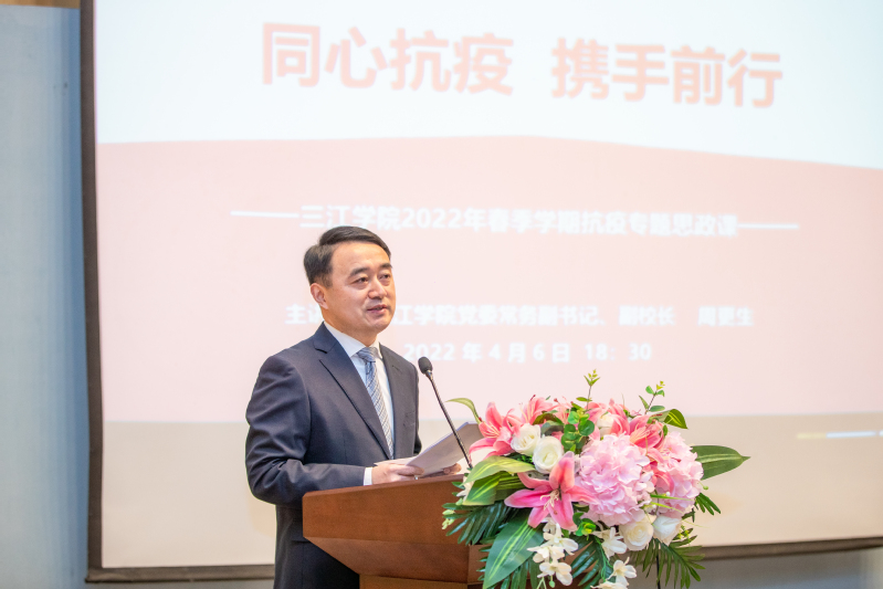 4月6日晚18点30分,beat365在线唯一官网主题为“同心抗疫 携手前行”的抗疫专题思政课正式开讲,全校学生党员、校院两级学生会成员、大学生自律委员会、易班工作站主要学生干部等近千人以线上线下相结合的方式“同上一堂思政课”,beat365在线唯一官网党委常务副书记、副校长周更生在铁心桥主校区学术报告厅主讲,报告厅线下50人,线上500余人,以及分布在其他三个校区多媒体教室的学生们聆听了专题思政课。