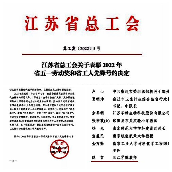 为表彰先进、树立榜样,营造劳动光荣、知识崇高、人才宝贵、创造伟大的社会风尚,激励全省广大职工立足新时代、担当新使命、展现新作为,五一劳动节前夕,江苏省总工会发布《关于表彰2022年省五一劳动奖章和省工人先锋号的决定》,beat365官网机械与电气工程学院徐智老师荣获江苏省五一劳动奖章。