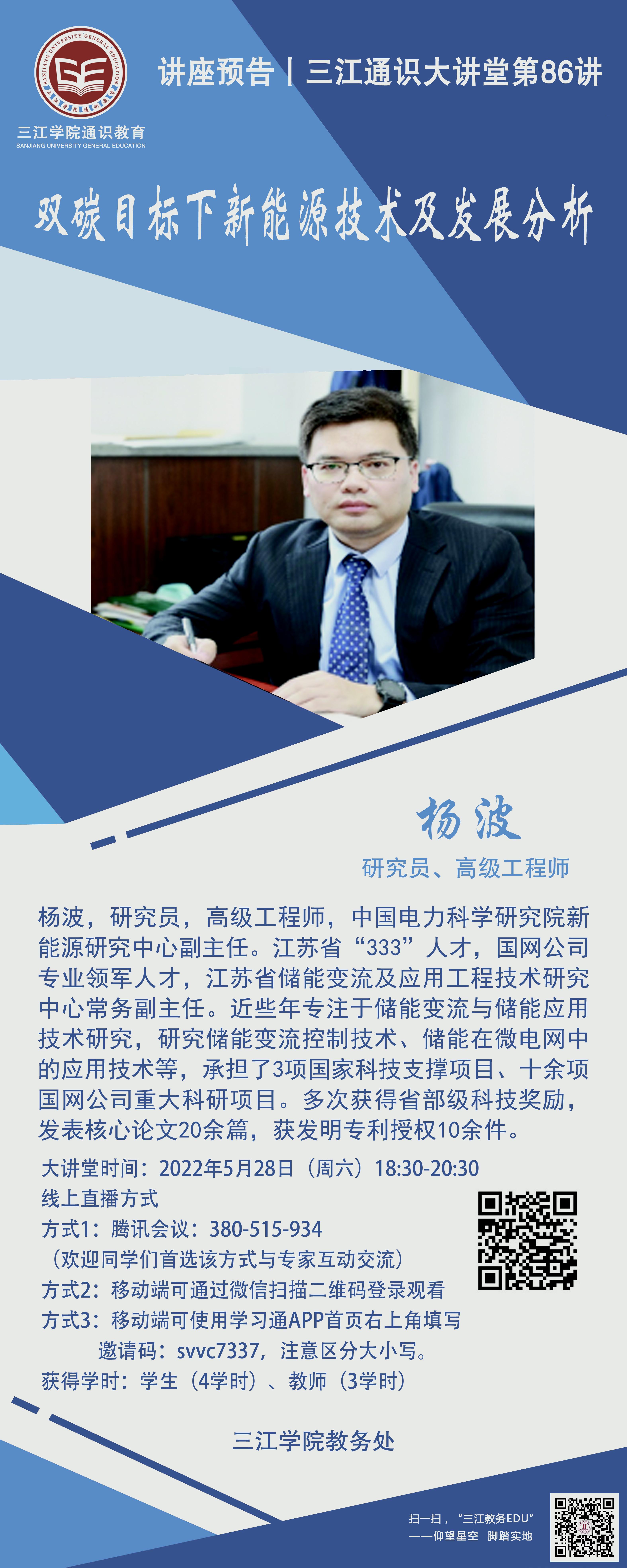 大讲堂专家:杨波,研究员,高级工程师,中国电力科学研究院新能源研究中心副主任。江苏省“333”人才,国网公司专业领军人才,江苏省储能变流及应用工程技术研究中心常务副主任。近些年专注于储能变流与储能应用技术研究,研究储能变流控制技术、储能在微电网中的应用技术等,承担了3项国家科技支撑项目、十余项国网公司重大科研项目。多次获得省部级科技奖励,发表核心论文20余篇,获发明专利授权10余件。