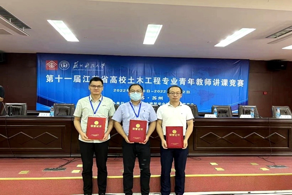 第十一届江苏省高校土木工程专业青年教师讲课竞赛于8月20日至22日在苏州举行。本次讲课竞赛由江苏省土木建筑学会教育工作委员会主办,苏州科技大学承办,beat365官网土木工程学院院长胡夏闽,副院长侯宇颖率领三位青年教师吴嵌嵌、端传捷、李涛参加了本次比赛。经过参赛选手的激烈角逐, 均荣获讲课竞赛二等奖。