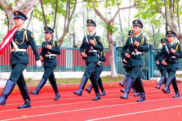 “出旗!”伴随着一声嘹亮的口令,迈着铿锵有力的步伐,国旗护卫队庄严地护送国旗入场。