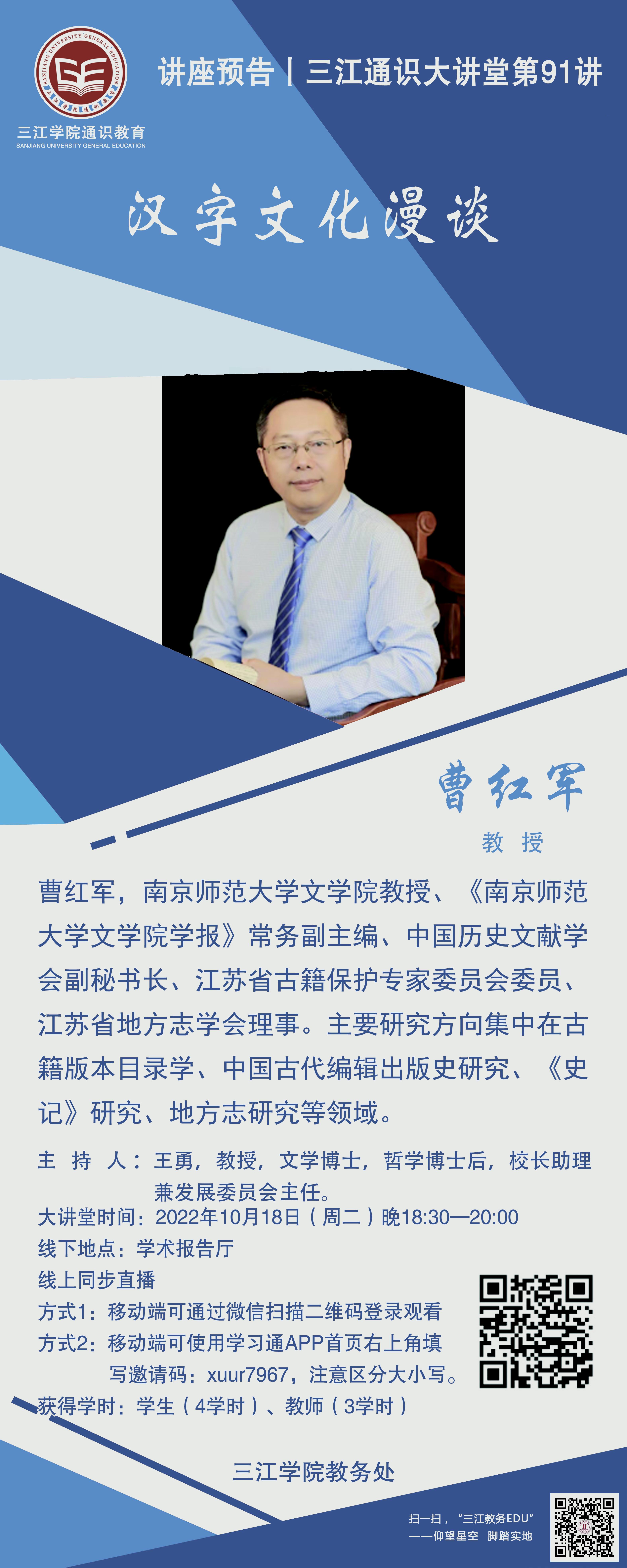大讲堂专家:曹红军,南京师范大学文学院教授、《南京师范大学文学院学报》常务副主编、中国历史文献学会副秘书长、江苏省古籍保护专家委员会委员、江苏省地方志学会理事。主要研究方向集中在古籍版本目录学、中国古代编辑出版史研究、《史记》研究、地方志研究等领域。