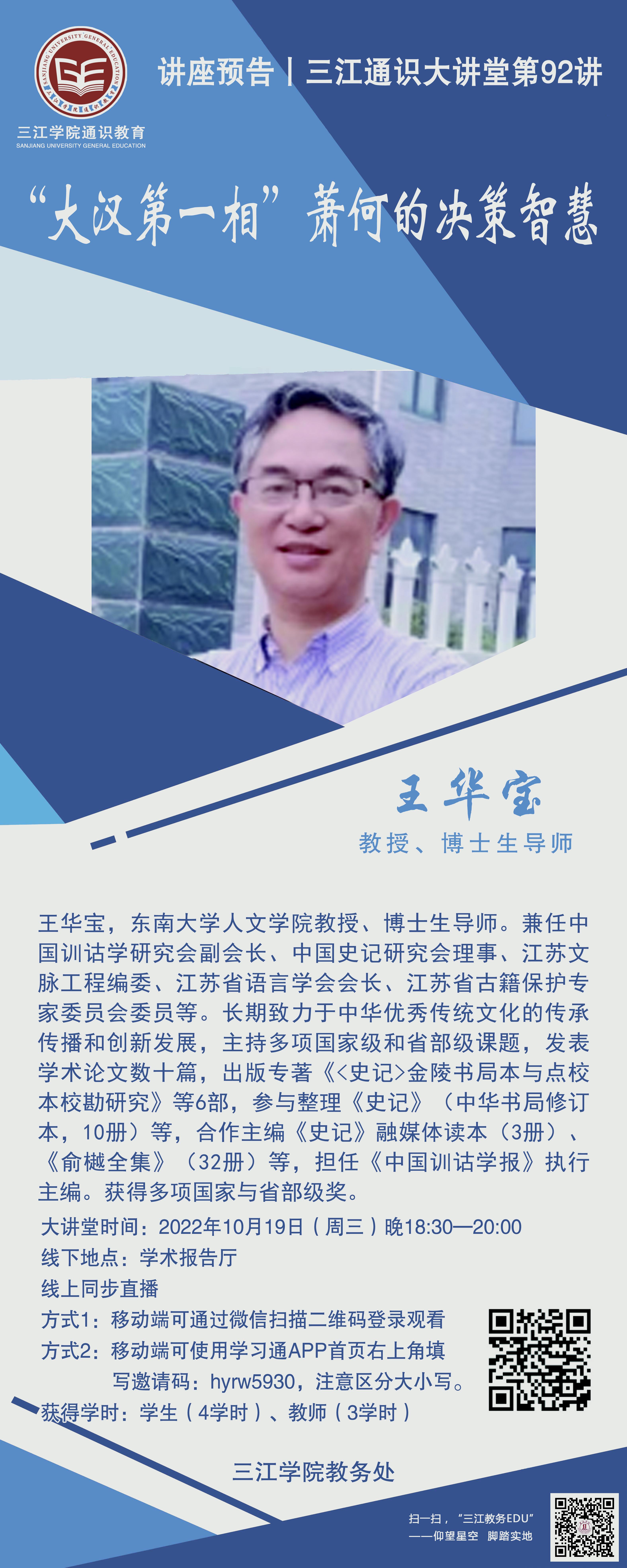 大讲堂专家:王华宝,东南大学人文学院教授、博导,历史系主任,院教学委员会主任,古文献学研究所所长。兼任中国训诂学研究会副会长、中国史记研究会理事、江苏文脉工程编委、江苏省语言学会会长、江苏省古籍保护专家委员会委员等。长期致力于中华优秀传统文化的传承传播和创新发展,主持多项国家级和省部级课题,发表学术论文数十篇,出版专著《<史记>金陵书局本与点校本校勘研究》等6部,参与整理《史记》(中华书局修订本,10册)等,合作主编《史记》融媒体读本(3册)、《俞樾全集》(32册)等,担任《中国训诂学报》执行主编。获得多项国家与省部级奖。