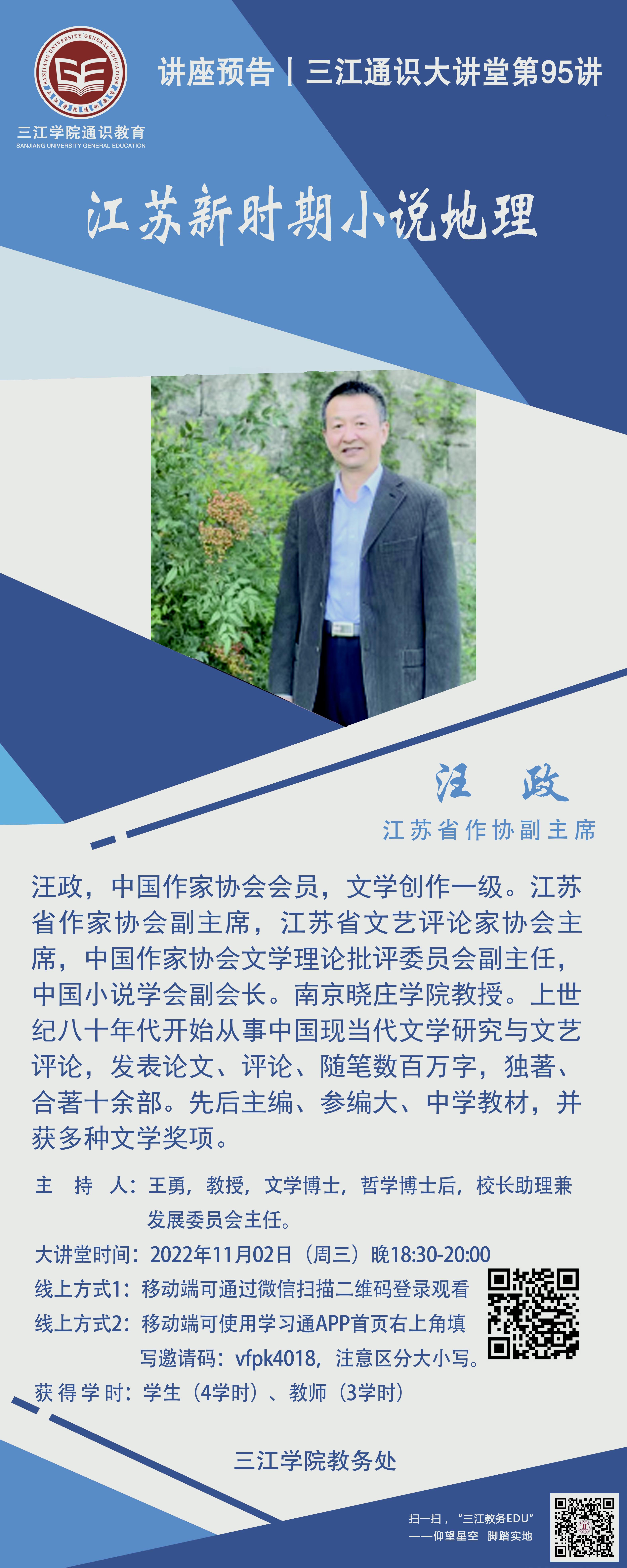 大讲堂专家:汪政,中国作家协会会员,文学创作一级。江苏省作家协会副主席,江苏省文艺评论家协会主席,中国作家协会文学理论批评委员会副主任,中国小说学会副会长。南京晓庄学院教授。上世纪八十年代开始从事中国现当代文学研究与文艺评论,发表论文、评论、随笔数百万字,独著、合著十余部。先后主编、参编大、中学教材,并获多种文学奖项。