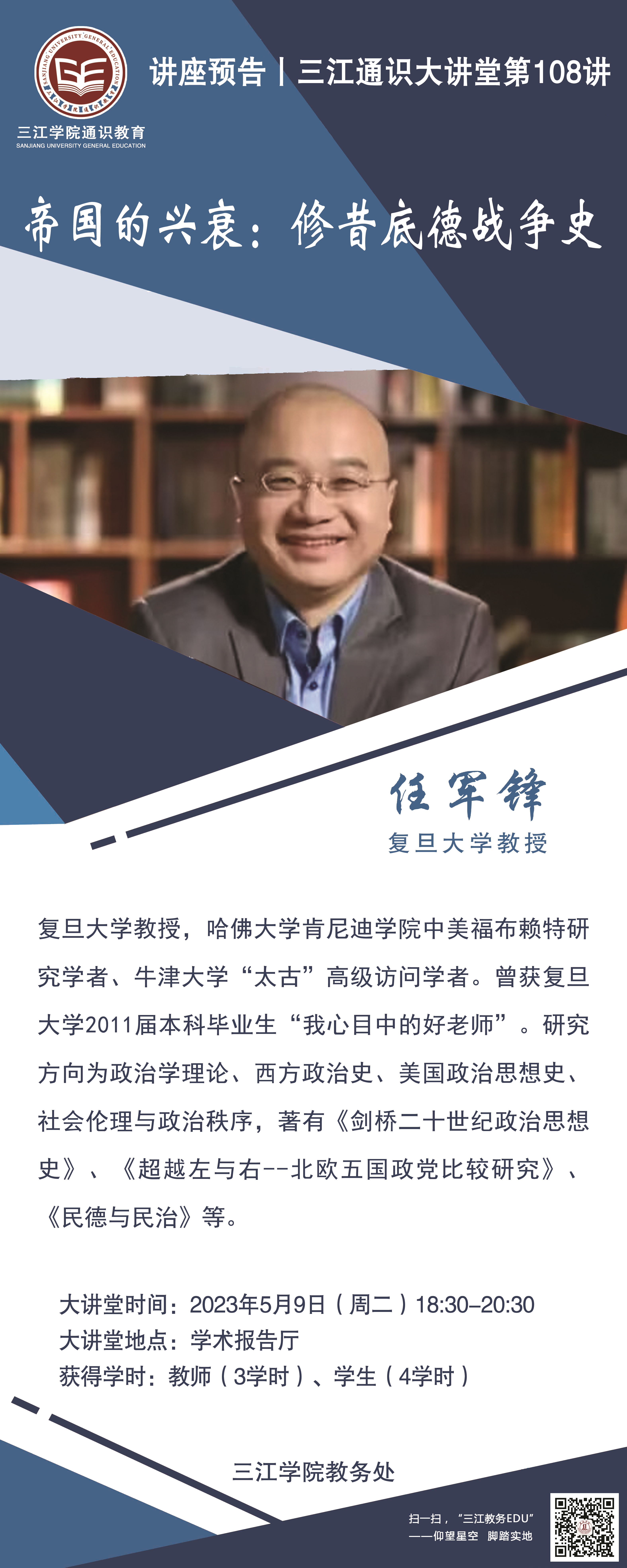 大讲堂专家:任军锋,复旦大学教授,哈佛大学肯尼迪学院中美福布赖特研究学者、牛津大学“太古”高级访问学者。曾获复旦大学2011届本科毕业生“ 我心目中的好老师”。研究方向为政治学理论、西方政治史、美国政治思想史、社会伦理与政治秩序,著有《剑桥二十世纪政治思想史》、《超越左与右--北欧五国政党比较研究》、《民德与民治》等。