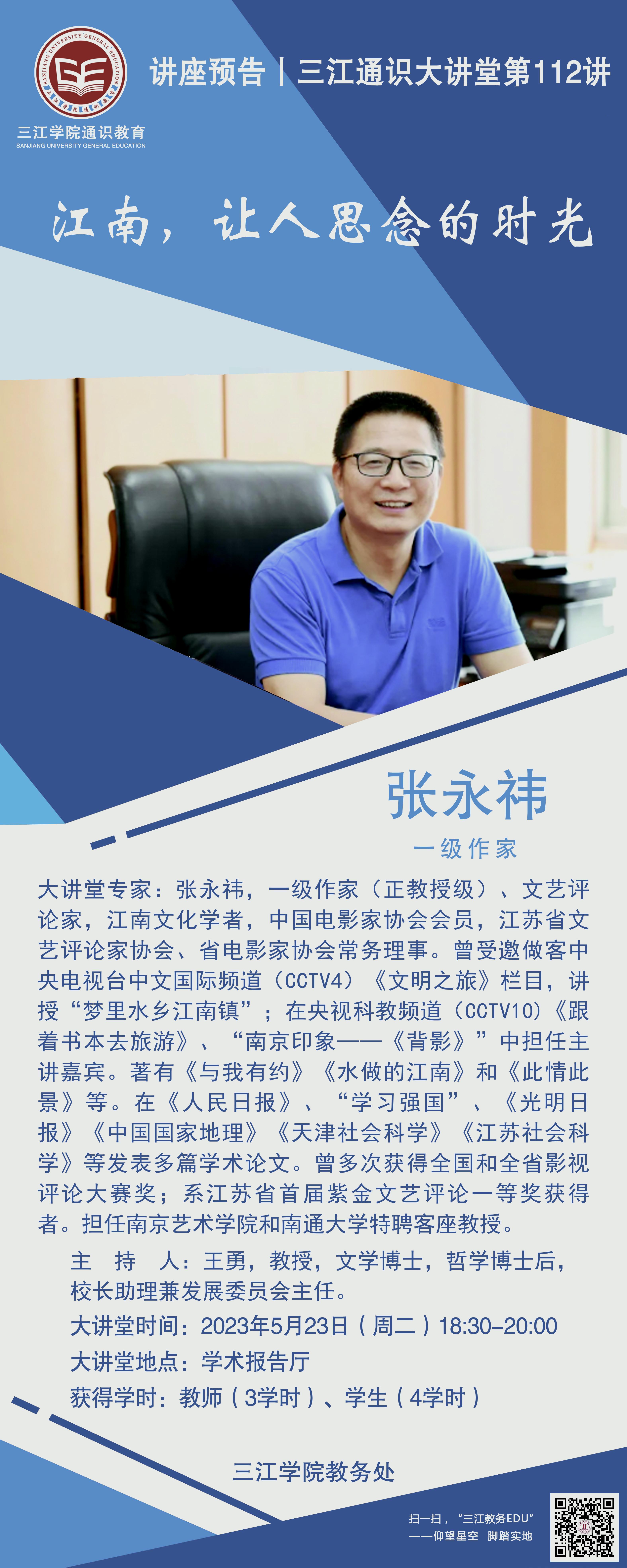 大讲堂专家:张永祎,一级作家(正教授级)、文艺评论家,江南文化学者,中国电影家协会会员,江苏省文艺评论家协会、省电影家协会常务理事。曾受邀做客中央电视台中文国际频道(CCTV4)《文明之旅》 栏目,讲授“梦里水乡江南镇”;在央视科教频道(CCTV10) 《跟着书本去旅游》、“南京印象一一《背影》 ”中担任主讲嘉宾。著有《与我有约》、《水做的江南》和《此情此景》等。在《人民日报》、“学习强国”、《光明日报》、《中国国家地理》、《天津社会科学》、《江苏社会科学》等发表多篇学术论文。曾多次获得全国和全省影视评论大赛奖;系江苏省首届紫金文艺评论一等奖获得者。担任南京艺术学院和南通大学特聘客座教授。