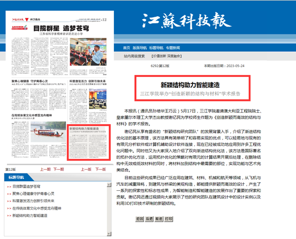 目前这些研究成果已经广泛应用在建筑、材料、机械和航天等领域,从飞机与汽车的减重降耗,到建筑与桥梁的美观构造,都能提供新颖而高效的设计,产生了一系列的探索性和标志性成果,为智能制造和智能建造的发展作出了重要的探索和贡献。谢亿民还通过视频向大家展示了他的研究团队在建筑设计中的设计实例以及利用3D打印技术研制的新颖结构。