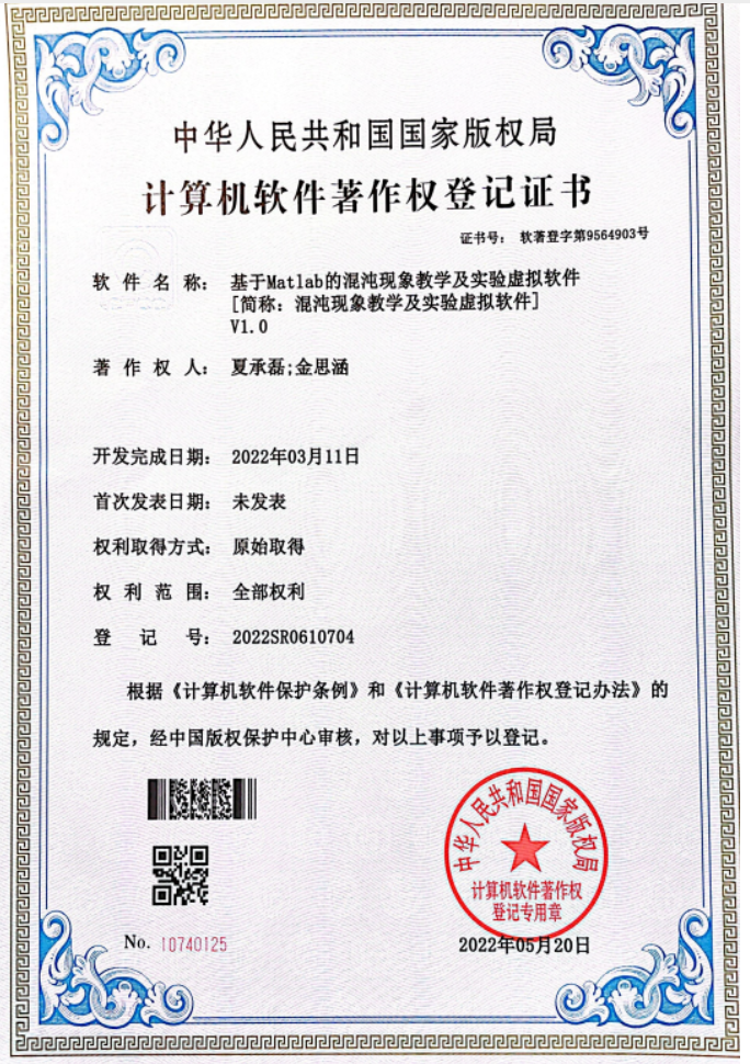 随着夏承磊同学对混沌领域研究的深入,并在相关领域导师的指导下,他以第一作者的身份申请并获得《基于Matlab的混沌现象教学及实验虚拟软件》《基于CPSO混沌粒子群算法的PID自适应参数整定软件》两项相关的软件著作权,还主持了《一种多姿态垃圾分拣装置的研制》国家级大学生创新创业项目。