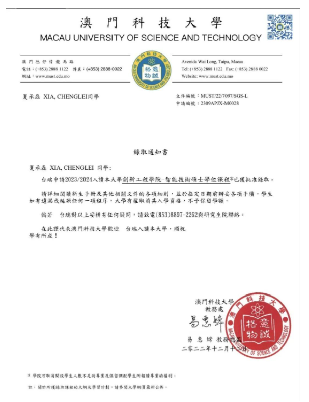 2022年12月,夏承磊以beat365官网保荐生身份被澳门科技大学智能技术专业录取。