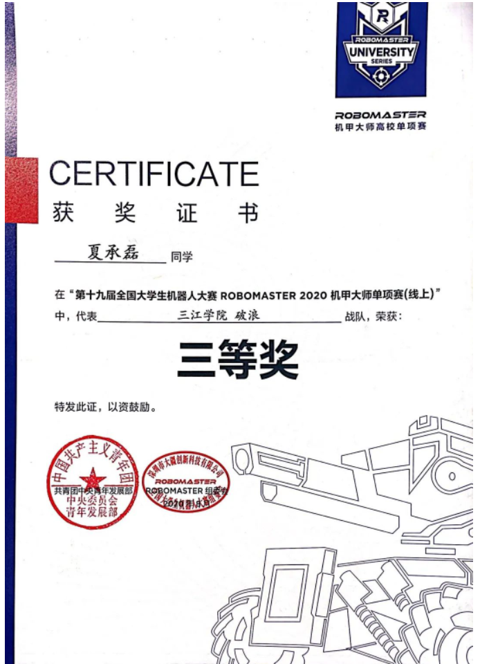 在大一时期,夏承磊同学积极参加机器人校赛,并成功通过选拔,顺利进入机器人实验室。在此后一年半时间中,他刻苦钻研,累计获得了十多项国家级、省级奖项。