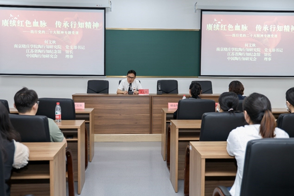在师德馆会议室,大家聆听了江苏省陶行知纪念馆何文秋馆长“赓续红色血脉传承英烈精神——践行党的二十大精神专题党课”的专题报告。何文秋馆长介绍了陶行知先生的教育思想与教育实践历程,以及晓庄十烈士的光辉事迹等。