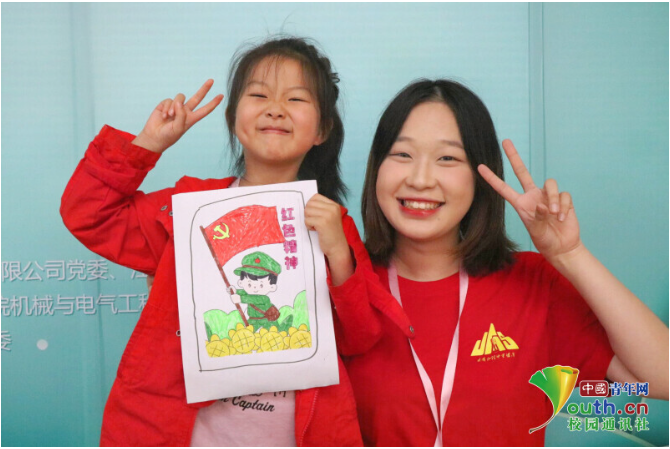 图为小朋友和志愿者共同完成红色画作后的合照。中国青年网通讯员 熊钰灵摄