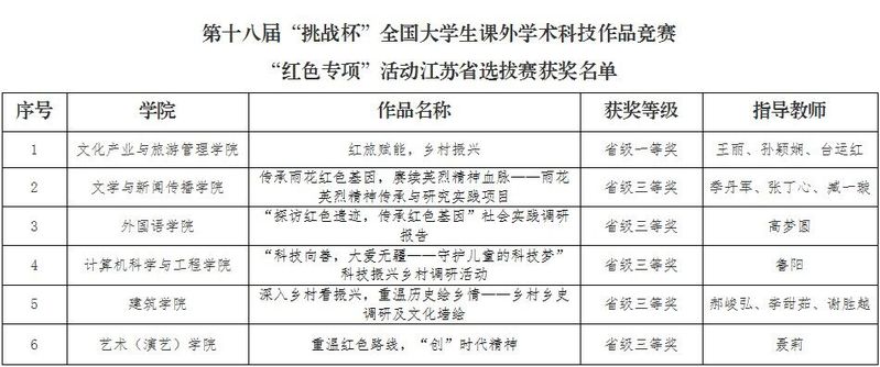 近日,共青团江苏省委对第十八届“挑战杯”全国大学生课外学术科技作品竞赛“红色专项”活动江苏省选拔赛获奖情况进行公示,经学校推荐、资格审查、专家评审、线上答辩这四个环节,beat365官网获得一等奖1项、三等奖5项,在获奖层次上取得新突破。