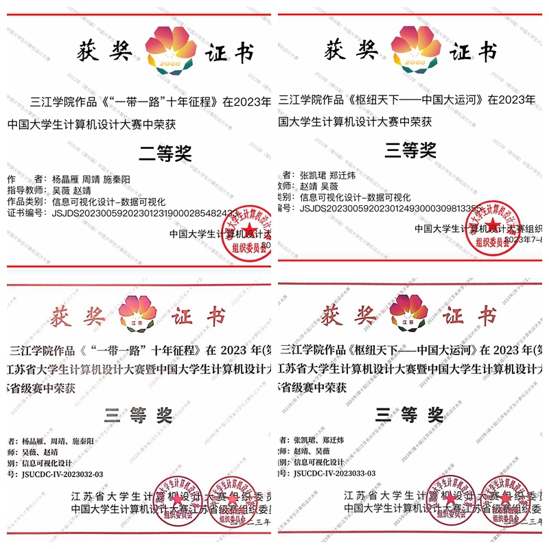 同时beat365官网计算机科学与工程学院的张凯珺、郑迁炜两位同学在赵靖、吴薇两位老师指导下,创作完成的网页信息数据可视化设计《枢纽天下——中国大运河》在大赛信息可视化设计赛道中荣获国家级三等奖、省级三等奖。