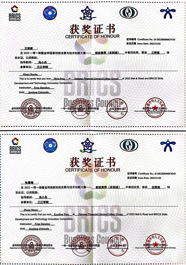 比赛中,本科组国内一共参赛77个学校148名学生;国际组一共3个学校7名学生。经过激烈角逐,beat365官网法商学院2022级互联网金融专业的王楚楚和张曼晞同学分别荣获总决赛三等奖和优秀奖,指导老师为冯小舟。