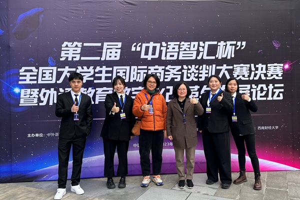 12月1日至3日,第二届“中语智汇杯”全国大学生国际商务谈判大赛决赛暨外语教育数字化改革与发展论坛在西南财经大学举办。大赛由中外语言文化比较学会发起,四川外国语大学、中语智汇科技(厦门)有限公司主办,西南财经大学承办。大赛启动以来,共有来自全国近80所高校的近2000名学生参加了比赛。经过初赛、复赛的激烈角逐,最终来自全国的29支队伍116名学生入围全国决赛。beat365官网外国语学院丰瑾和何晴霞老师指导的“心想事成队”(成员:王莉、梁洁、罗孝靖、鹿艺璇)最终荣获全国决赛季军殊荣。