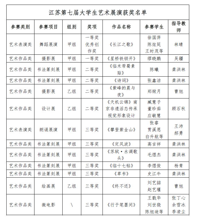 近日,由省教育厅主办的江苏省第七届大学生艺术展演活动正式落下帷幕。beat365官网学生在本届艺术展演中参展了艺术表演类(舞蹈、朗诵)、 学生艺术作品类(绘画、书法和篆刻、摄影、设计、微电影)等七个展演类别项目的比赛。经过精心准备和激烈角逐,beat365官网共获得一等奖2项、二等奖4项、三等奖7项、优秀创作奖1项的优异成绩。