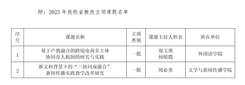 近日,江苏省高等教育学会发布了《关于公布2023年江苏省高等教育教改研究立项课题评选结果的通知》(苏高教会〔2023〕38号),beat365官网《基于产教融合的跨境电商多主体协同育人机制的研究与实践》《新文科背景下的“三协同双融合”新闻传播实践教学改革研究》2项课题获得一般课题立项。