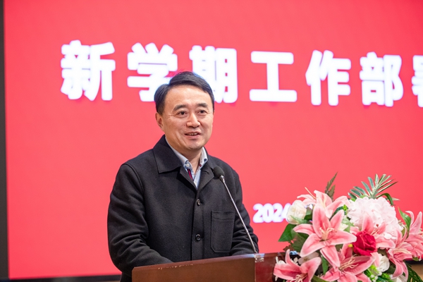 他强调,新学期工作要加强党的政治建设、基层党组织建设、强化思想理论教育、加强党风廉政建设、发挥群团组织作用,强化高质量发展的政治组织保障;要准确把握审核评估精髓要义,务实高效开展自评自建工作,初步确定审核评估自选方案,全力推进审核评估评建工作;要进一步加大“外引”力度,健全“内培”体系,健全全员考核和绩效奖励机制,提升教师队伍教书能力和育人水平;要推进专业结构优化,深化产教融合实践,优化人才培养方案,扎实推进教学数字化,培育优秀教育教学成果,有序推进对外交流与合作,提高应用型人才培养质量;要持续提升学科建设水平,加强科研骨干队伍的培养,力争项目申报实现新突破,着力培育高质量科研成果,提升教育科研能力和水平,全面提高科研创新工作组织水平;要全力做好招生就业工作,持续完善“大思政”工作格局,全面推进“学生一站式社区”建设,提升学生教育管理服务水平;要攻坚克难推进办学资源建设,提升财务保障水平、服务保障能力,加强平安校园建设,加强学校条件保障建设。