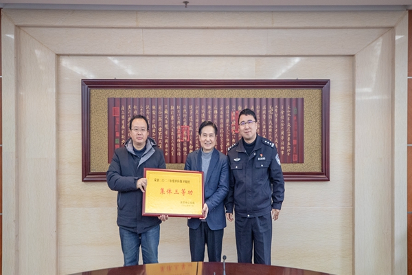 南京市公安局内保支队副支队长张研代表南京市公安局为保卫处颁授集体三等功奖牌