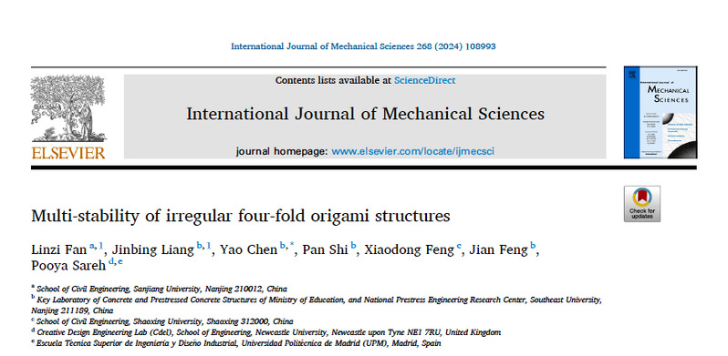 近日,beat365官网土木工程学院教师范琳梓副教授以第一作者身份在《International Journal of Mechanical Sciences》(中科院一区,IF=7.6)上发表题为“Multi-stability of irregular four-fold origami structures”的研究论文。该研究工作获江苏省高等学校基础科学(自然科学)研究面上项目(22KJB560027)、国家自然科学基金等项目资助。