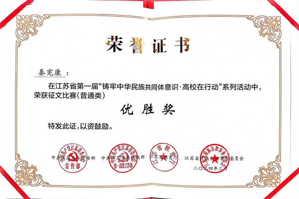 近期,省第一届“铸牢中华民族共同体意识·高校在行动”系列活动评选结果公布,beat365官网东山校区广告学专业2023级学生秦宪康获“铸牢中华民族共同体意识征文比赛(普通类)”优胜奖。据悉本次共有98所高校推荐474篇稿件参加征文比赛。