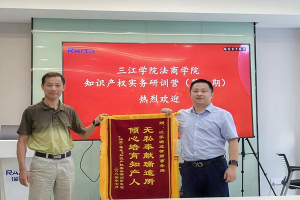 法律系主任龚大春老师再次感谢江苏瑞途律师事务所的大力支持和律师们百忙之中的无私奉献,并代表本次研训营同学为瑞途所赠与一面“无私奉献瑞途所,倾心培育知产人”的锦旗,为表谢意。同时,对同学们的优秀表现表示欣慰和喜悦,也希望同学们能将所学到的知识运用到学习和将来的工作中,秉持着这种热忱的心态一直逐梦未来。