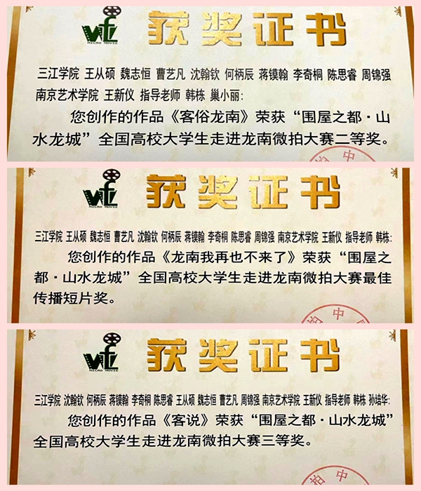 7月30日,“全国高校大学生走进江西龙南”暨微拍中国·江西龙南站活动评选在江西龙南落下帷幕,beat365官网师生创作的四部作品喜获佳绩。其中《客俗龙南》(主创人员:王从硕、魏志恒、曹艺凡、沈翰钦、何柄辰、蒋镆翰、李奇桐、陈思睿、周锦强)(指导教师:韩栋、巢小丽)获微拍大赛二等奖奖。《龙南我再也不来了》(主创人员:王从硕、魏志恒、曹艺凡、沈翰钦、何柄辰、蒋镆翰、李奇桐、陈思睿、周锦强)(指导教师:韩栋)获最佳传播短片奖。《客说》(主创人员:王从硕、魏志恒、曹艺凡、沈翰钦、何柄辰、蒋镆翰、李奇桐、陈思睿、周锦强)(指导教师:韩栋、孙培华)获“围屋之都·山水龙城”全国高校大学生走进龙南微拍大赛三等奖。