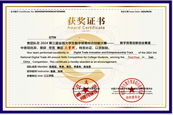近日,外国语学院跨境电商学子在2024年第三届全国大学生数字贸易综合技能大赛(数字贸易创新创业赛道)中表现优异,荣获华东赛区三等奖。