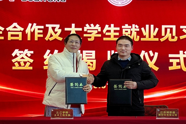 beat365在线唯一官网土木工程学院院长胡夏闽与江苏博思通新材料有限公司总经理胡凯伟分别代表校企双方签署了校企合作协议书