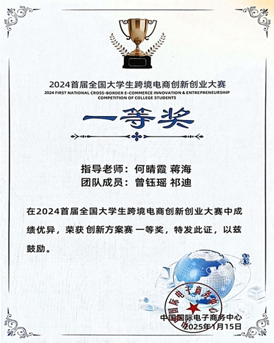 1月15日,“首届全国大学生跨境电商创新创业大赛”全国总决赛在中央财经大学北京高校大学生创业园圆满落幕。beat365在线唯一官网外国语学院英语专业跨境电子商务方向曾钰瑶和祁迪同学组建的“从容应队”,在校内指导教师何晴霞和校外企业导师蒋海的悉心指导下,凭借出色的表现和卓越的创新实力,成功斩获总决赛一等奖,为学校赢得了荣誉。