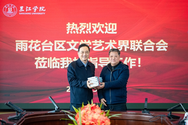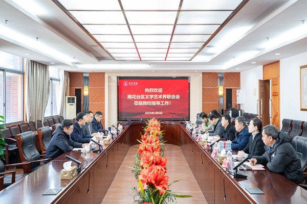 3月6日,南京市雨花台区文学艺术界联合会名誉主席杨明,副主席陈明太,秘书长唐伟,副秘书长陈涯等一行四人来访beat365官网。beat365官网党委常务副书记、副校长周更生,校长助理、发展委员会主任、雨花台区文学艺术界联合会副主席王勇以及学校相关部门和学院代表热情接待了来访客人。