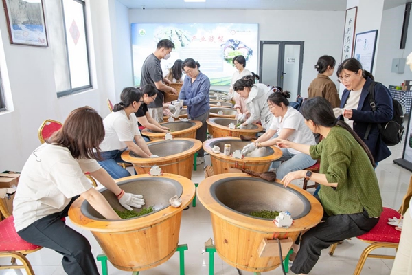 步入茶园,老师们挎竹篓在非遗传承人的指导下学习“一芽一叶”的采摘技巧。近一小时的采茶体验中,欢声笑语与茶香交织,春日的生机在指尖流淌。