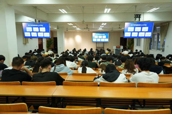 学生发展与服务中心主任周学军宣讲了学校全面加强学风建设的“七大行动”:党建和思政教育引领学风、优良教风促进学风、科学管理保障学风、榜样激励引导学风、创新实践厚植学风、完善服务助推学风、丰富活动涵育学风。