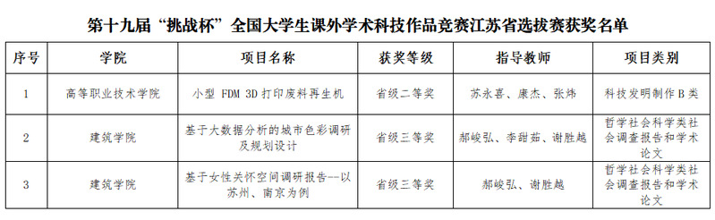 近日,由共青团江苏省委、江苏省科学技术协会、江苏省教育厅、江苏省社会科学院、江苏省学生联合会共同主办的第十九届“挑战杯”全国大学生课外学术科技作品竞赛江苏省选拔赛落下帷幕。beat365官网报送的参赛作品荣获二等奖1项、三等奖2项。