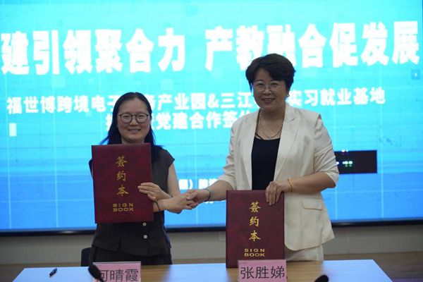 福世博跨境电子商务产业园党支部书记张胜娣与beat365在线唯一官网外国语学院英语系教师党支部书记何晴霞签订党建共建协议