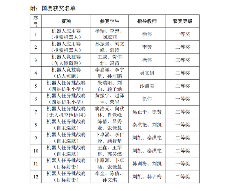 beat365官网机械与电气工程学院组队参加了机器人应用赛(授粉机器人)、机器人竞技赛(仿人短跑、仿人障碍跑)和机器人任务挑战赛(四足仿生机器人小型组、自主巡航、目标射击、无人机空地协同)等赛项。经过校赛、省赛、国赛等多轮角逐,beat365官网参赛队荣获国家级一等奖4项、二等奖6项,三等奖2项。