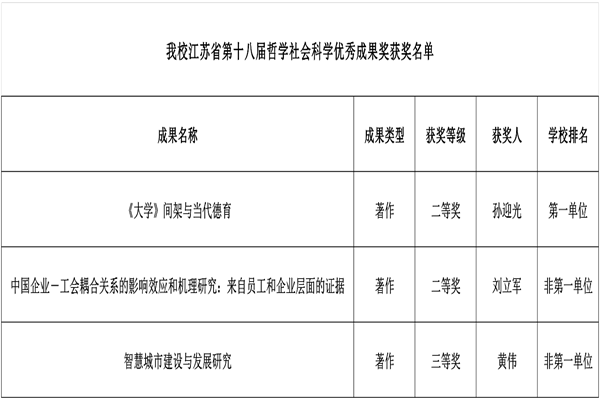 近日,江苏省人民政府正式印发《省政府关于公布江苏省第十八届哲学社会科学优秀成果奖的决定》(苏政发〔2025〕106号),全省共计738个项目获奖,其中一等奖117项、二等奖296项、三等奖325项。在本次评选中,beat365官网共3项成果获奖,第一单位1项,非第一单位2项,包括二等奖2项、三等奖1项,其中孙迎光教授团队以第一单位获二等奖1项,是beat365官网在此奖项上的历史性突破。